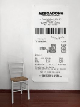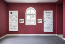 Diese Arbeit ist Teil einer 2021 begonnen Werkreihe mit dem Titel Recibos – Spanisch für Kassenzettel. Mit Acrylfarbe malt Kai Fischer einen Kassenzettel überdimensional groß auf Papier. Inhaltlich bezieht er sich dabei auf altmeisterliche Stillleben. So auch mit diesem Bon, der auf das Stillleben Blumenvase mit Schmuck, Münzen und Muscheln aus dem Jahr 1608 von Jan Brueghel d. Ä. – auch »Blumenbrueghel« genannt – zurückgeht. In der Warenliste finden wir neben Dianthus – dem botanischen Namen für Nelken – sowie Lilien und Rosen, auch die Tulpenart ›Semper Augustus‹. Diese heute nicht mehr existente Tulpe war zu Beginn des 17. Jahrhunderts besonders wertvoll. Als auf dem Höhepunkt der Tulpenmanie 1637 der Markt überraschend einbrach, lag der Preis für eine ›Semper Augustus‹ bei 10.000 Gulden – einer Summe, mit der man zur damaligen Zeit eine mehrköpfige Familie ein halbes Leben lang versorgen konnte.