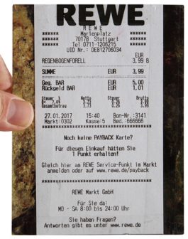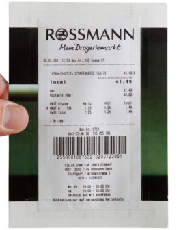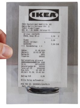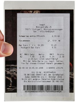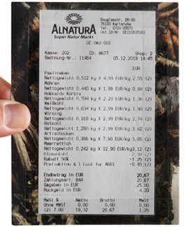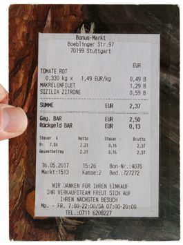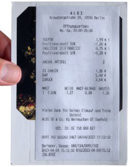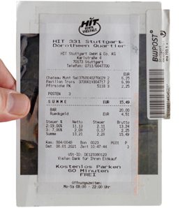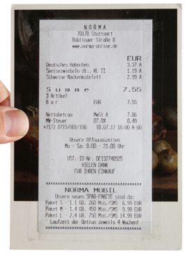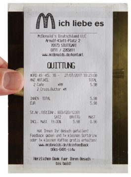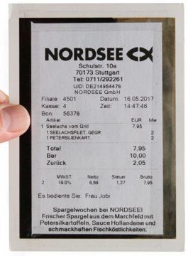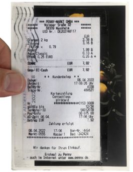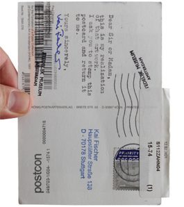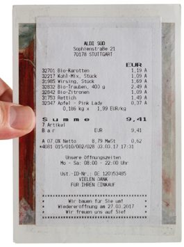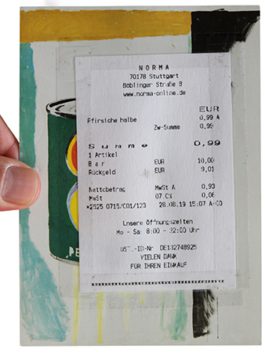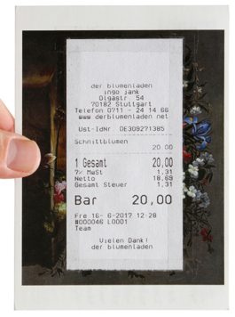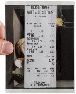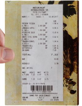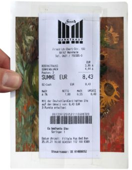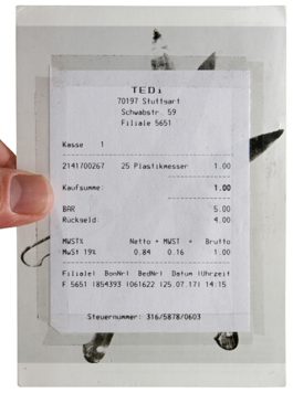 Postkarte, Kassenbon, Briefmarke, Tesa-Film, Stempelfarbe, Filzstift, Schreibmaschinentinte